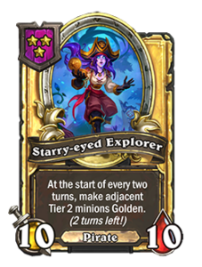 - 新:グレード3以下のランダムな味方のミニオン1体をゴールデンにする。各ターンの開始時、これを繰り返す。