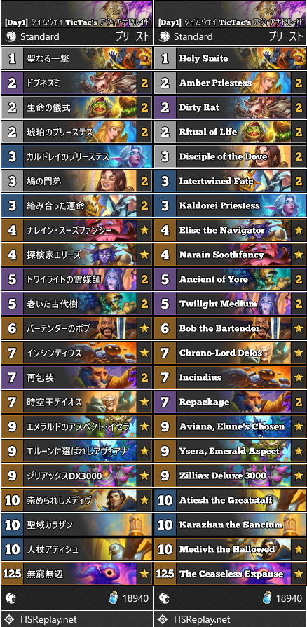 [Day1] タイムウェイ TicTac’s アヴィアナプリースト 2025年11月5日 bandzero Deck - デッキ デッキ概要 TicTacが使用したアヴィアナプリースト。 エルーンに選ばれしものアヴィアナにより全てのカードを1コストで使用できるようするデッキ。 崇められしメディヴや時空王デイオスなど強力なレジェンドカードや、琥珀のプリーステスや鳩の門弟など序盤を支える新カードが採用されています。 デッキ デッキコード Copy ソース 関連記事 Aviana Priest, Priest, アヴィアナプリースト, プリースト
