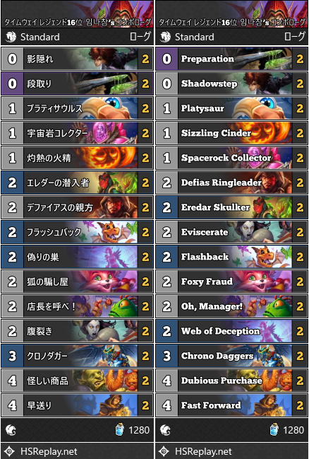 デッキ全体が低コストのカードだけで構成された速攻型のデッキ。後攻であれば1ターン目からコイン狐の騙し屋フラッシュバックなどで盤面展開が可能です。ミニオンで削った後は、直接打点カードでリーサルを狙います。