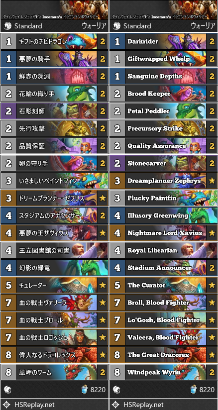 ドラゴンなどのミニオンと血の戦士ロゴッシュで戦うデッキ。ドラゴン以外にもいさましいペイントフィンや偉大なるドラコレックスなどの種族持ちミニオンを採用し、キュレーターでドローできるようにしています。