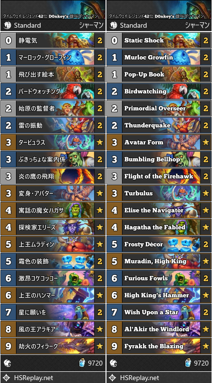 タイムウェイ レジェンド42位 D0nkey’s 雄叫びシャーマン 2025年11月12日 bandzero Deck - デッキ デッキ概要 D0nkeyがレジェンド42位を獲得した雄叫びシャーマン。 タービュラスや星に願いをでミニオン全体をバフして戦うデッキ。寓話の魔女ハガサで星に願いををスライムにすることで、早期にミニオン全体を強化できます。 後半は上王のハンマー+変身・アバターによる武器攻撃や、風の王アラキア、劫火のフィラークなどによる直接打点でリーサルが狙えます。戦績は31勝10敗(勝率76%)とのこと。 デッキ デッキコード Copy ソース https://x.com/D0nkeyHS/status/1987741073276387347 関連記事 Battlecry Shaman, Shaman, シャーマン, 雄叫びシャーマン