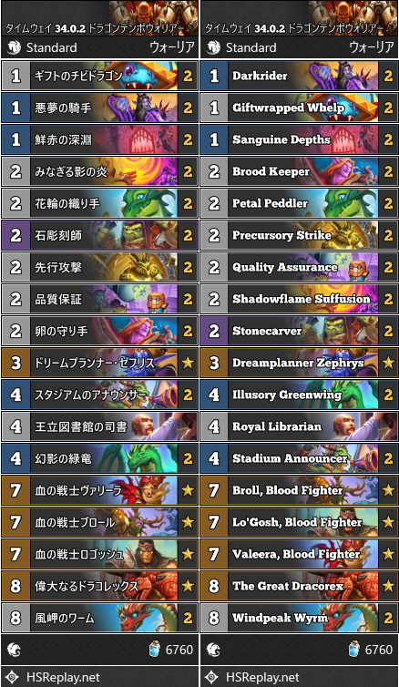 タイムウェイ 34.0.2 ドラゴンテンポウォリアー 2025年11月14日 bandzero Deck - デッキ デッキ概要 タイムウェイ 34.0.2 環境で使用されているドラゴンテンポウォリアー。 ドラゴンなどのミニオンと血の戦士ロゴッシュで戦うデッキ。キュレーター構成ではなく、幻影の緑竜を2枚採用した構成で、品質保証により幻影を引くことができるようになっています。 武器装備のスタジアムのアナウンサーや、直接打点を与えつつ悪夢の恵みミニオンを発見するみなぎる影の炎なども2枚ずつ採用されています。 デッキ デッキコード Copy ソース 関連記事 Dragon Warrior, Tempo Warrior, Warrior, ウォリアー, テンポウォリアー, ドラゴンウォリアー