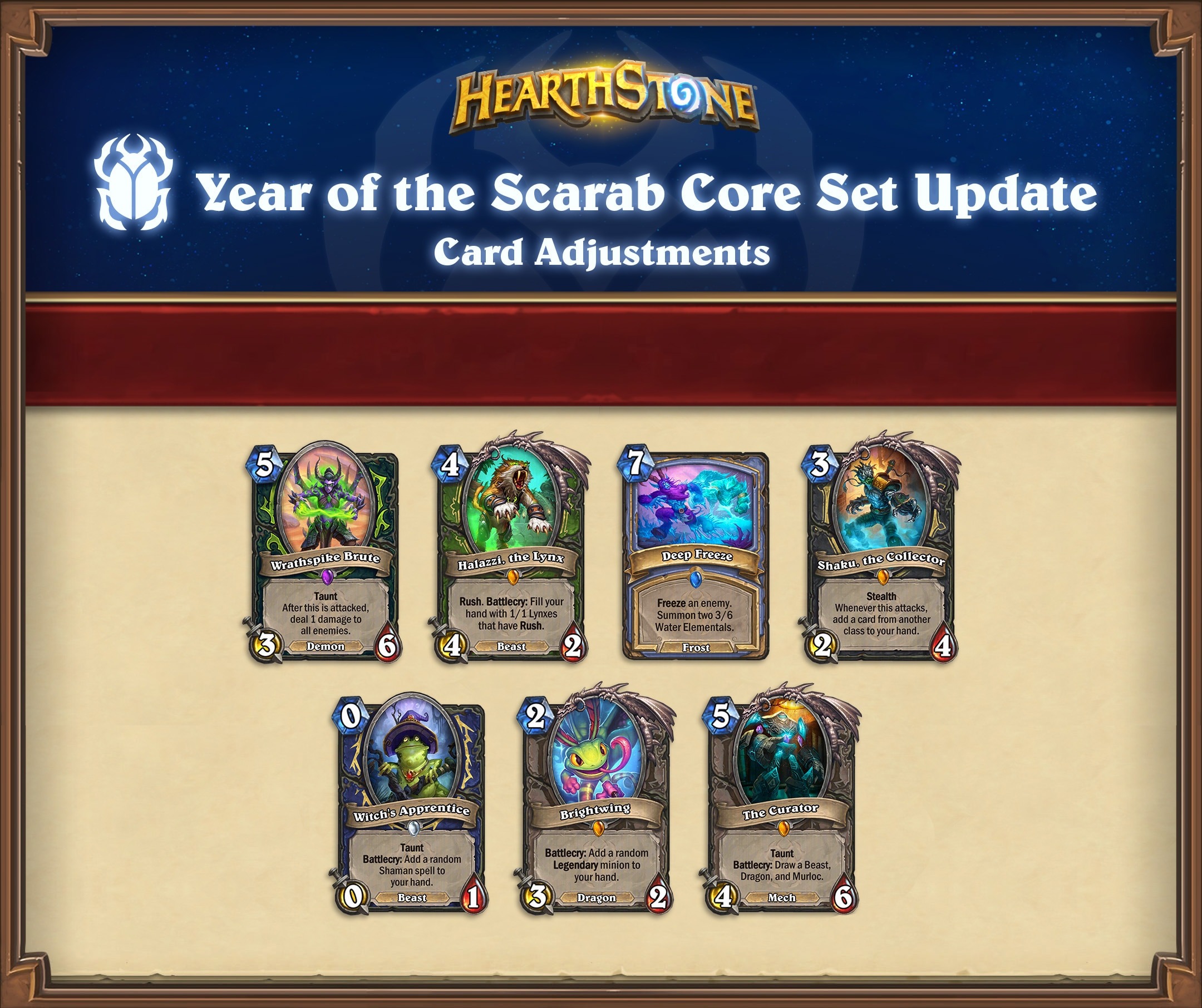 ハースストーンの新年度「スカラベ年」のコアセット情報が公開されました。コアセットは全プレイヤーが無料で使用できるセットです。スカラベ年では、カードの入れ替え・調整だけでなく、新カードも追加されます。