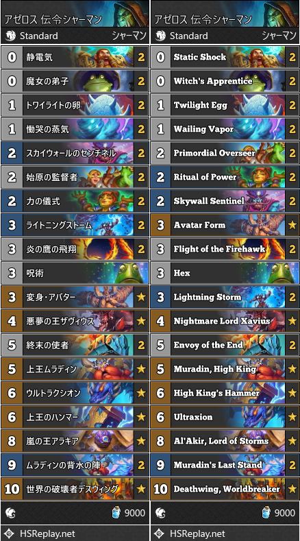 アゼロス 伝令シャーマン 2026年3月26日 bandzero Deck - デッキ デッキ概要 終焉のアゼロス初期環境で使用されている伝令シャーマン。 アラキアの兵士による隣接ミニオンバフを使って戦うミニオン主体のデッキ。他種族構成になっており、炎の鷹の飛翔によるバフ+ドローがしやすくなっています。 盤面展開を狙いつつも、力の儀式による伝令+急襲エレメンタルやライトニングストームや変身・アバターによりミニオン除去も可能です。 デッキ デッキコード Copy ソース – 関連記事 Herald Shaman, Shaman, シャーマン, 伝令シャーマン